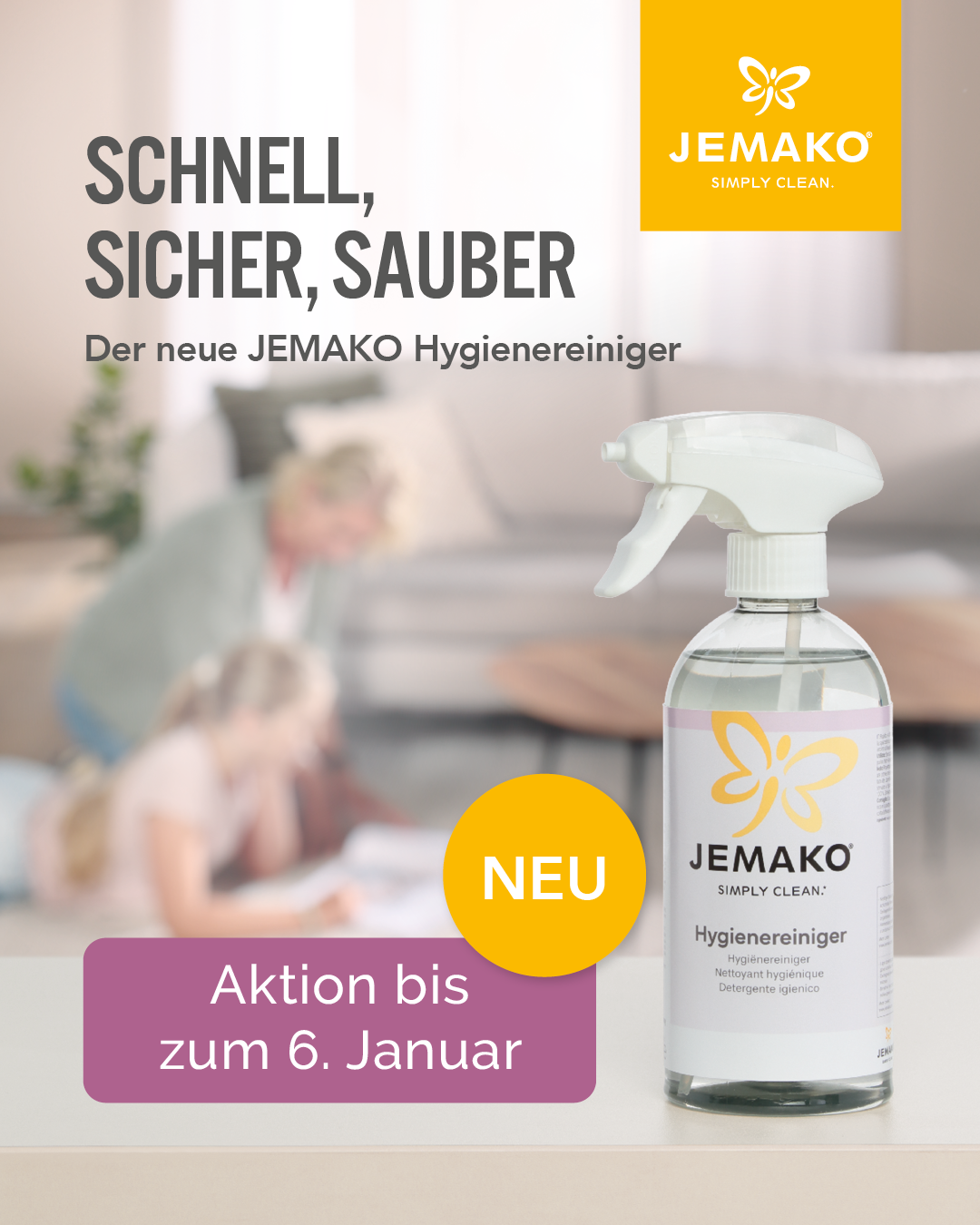 ✨ Der neue JEMAKO Hygienereiniger – für hygienische Sauberkeit im Bad, Wohnbereich oder Kinderzimmer. Entfernt zuverlässig leichte Kalkflecken von Oberflächen und Badböden.
